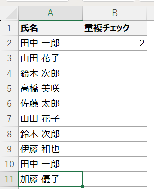 「B2~B11セル」にも重複チェックの数が反映されました。